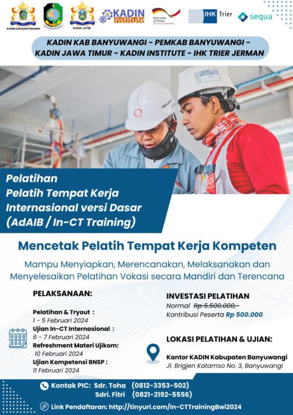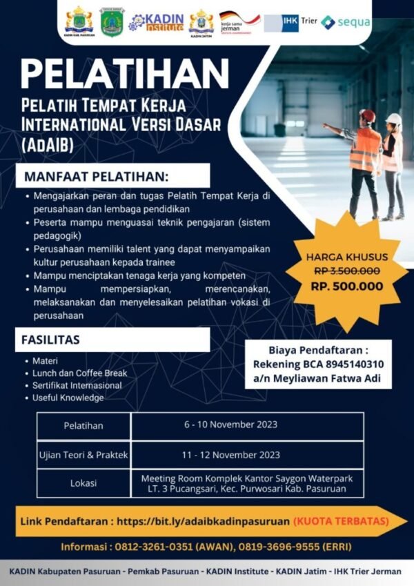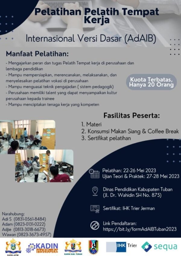 Pelatihan Pelatih Tempat Kerja (AdAIB) merupakan salah satu bentuk implementasi Peraturan Presiden Nomor 68 Tahun 2022 tentang revitalisasi pendidikan dan pelatihan vokasi. Program ini merupakan kegiatan rutin yang diselenggarakan oleh KADIN Jawa Timur dan KADIN Institute bekerja sama dengan IHK Trier Jerman.